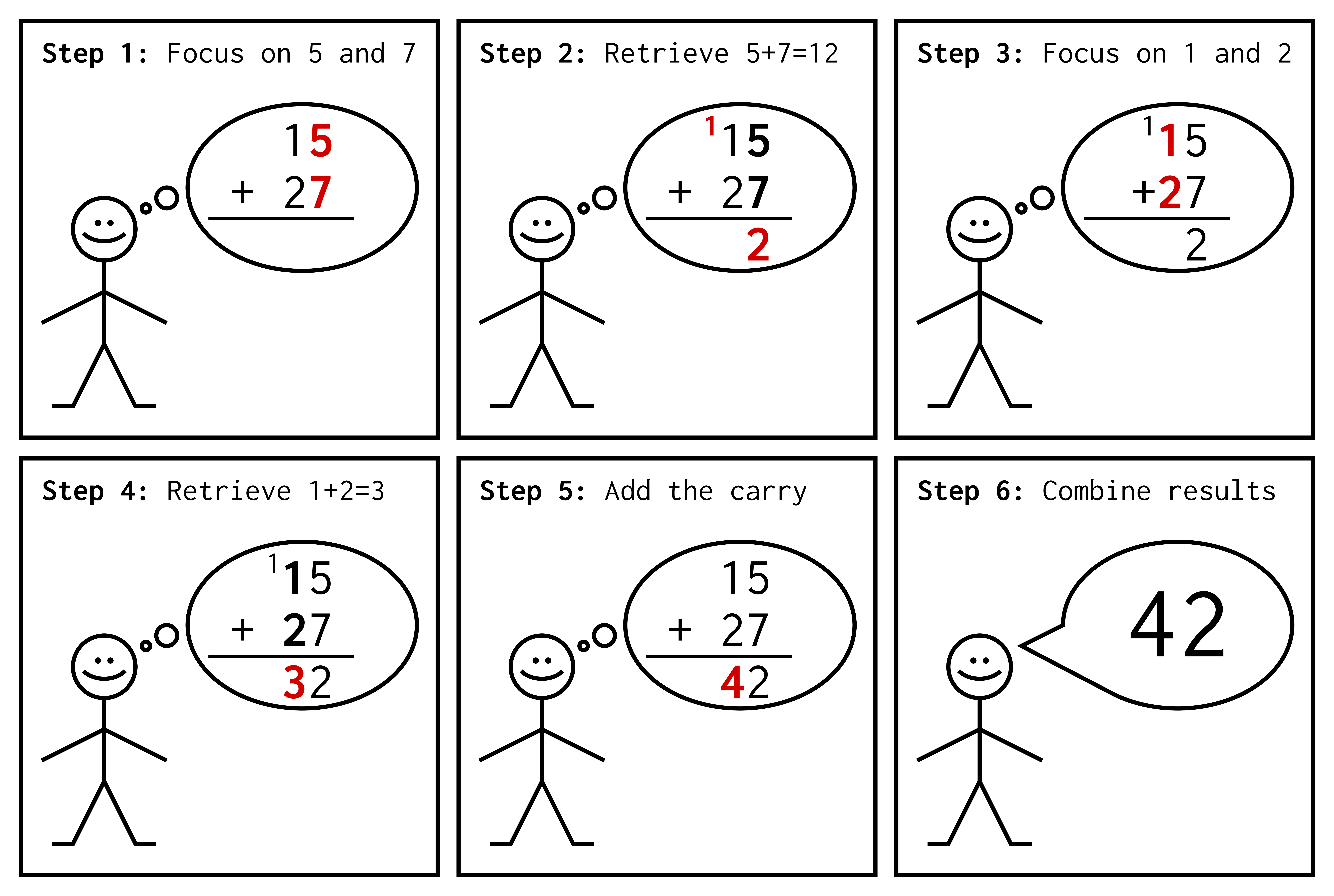 Problem solving involves multiple different cognitive abilities. Imagine you're asked to calculate the addition 15 plus 27 in your head. To find the result of this addition, in school you learned how to use an algorithm. In other words, you learned a planning of your behavior into a sequence of actions. For example, you would first focus your attention on the two units 5 and 7. Then, using your semantic memory, you would remember that 5 plus 7 equals 12. Then, you would focus your attention on the tens 1 and 2, while still remembering the carryover and the intermediate result 2 thanks to your working memory. Thanks to your semantic memory again, you would remember that 1 plus 2 equals 3, and that when you add the carry-over you obtain the result 4.And finally, you would combine your two intermediate results 4 and 2 to say that the result is 42.